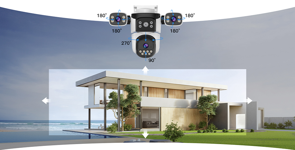 The CS621SR gimbal lens supports 0 * -270 ° translation and 0 ° -90 ° vertical rotation. The two adjustable lenses on the side support 0 ° -180 ° translation and 0 ° -180 ° vertical rotation, providing 360 ° protection for your home.