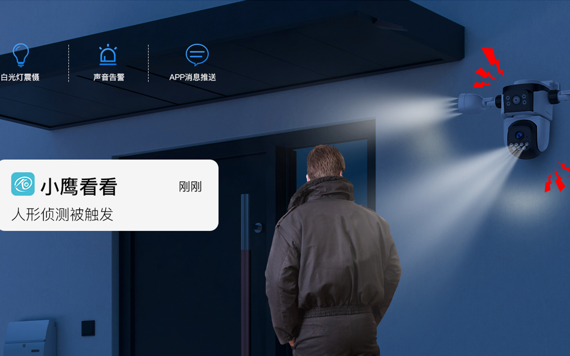 When someone is detected to have intruded, sound and white light flashing warnings will be issued, and real-time messages will be pushed to the mobile app