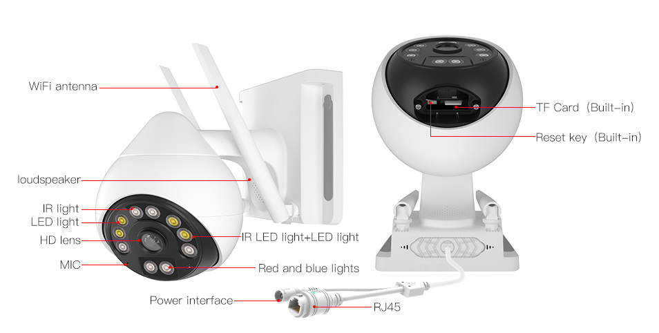 Delimitation detection, when the humanoid movement appears in the monitoring area, Red & blue flashing to alarm, built-in high power speaker and high sensitivity microphone, Mobile phone remote Two-way talk alarm, Active defense.