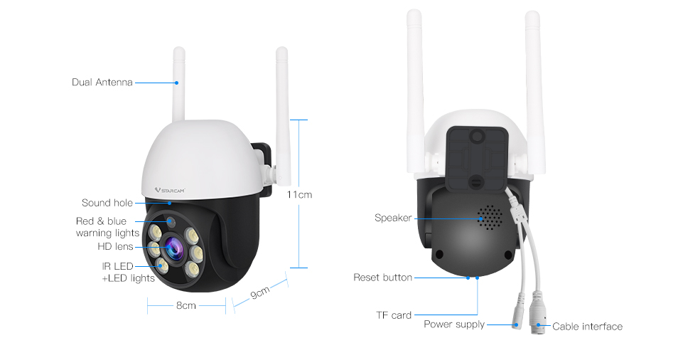 It comes with white and infrared LED lights to provide a clear full-color night view, and its spotlights ensure color night vision, making the night view as vivid as during the day.